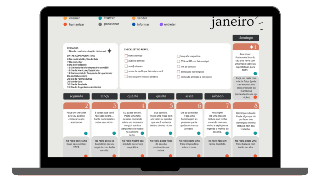 Um calendário com ideias de conteúdo que engajam e vendem. Validado por perfis de diferentes nichos. Mulheres comuns, sem conhecimento de marketing que estão crescendo sua presença digital, tornado-se autoridades em suas áreas e vendendo mais.
