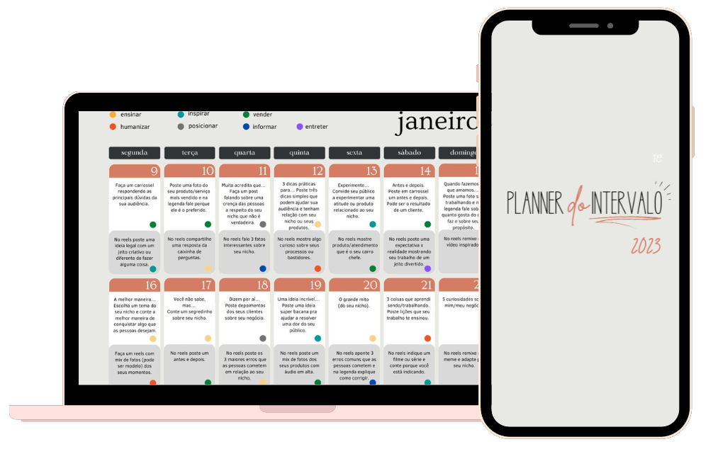 Tudo o que fazemos no Intervalo criativo é voltado para facilitar a vida de empreendedoras no mercado digital. Caso você sinta que o Planner não te atendeu, terá sete dias para pedir reembolso e devolveremos 100% do seu dinheiro.