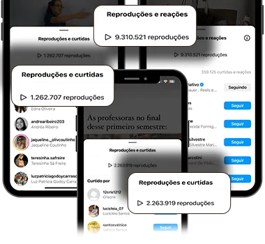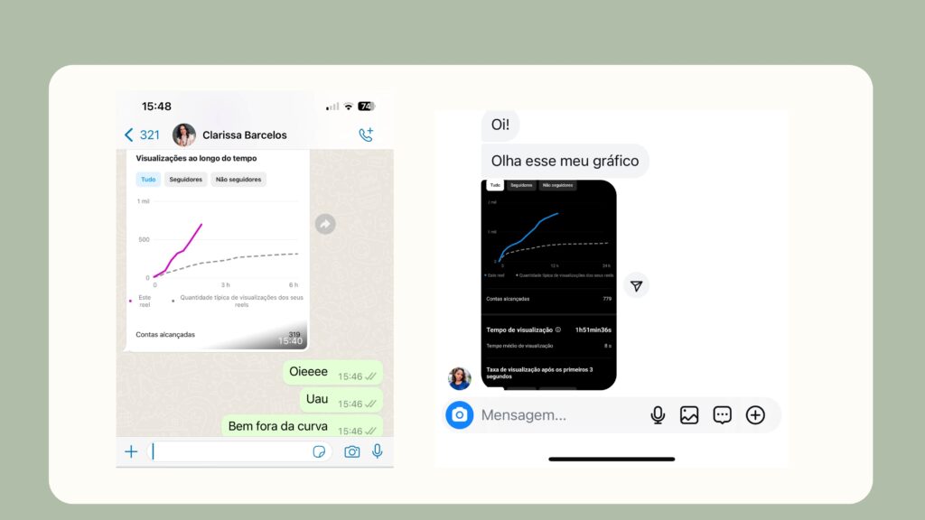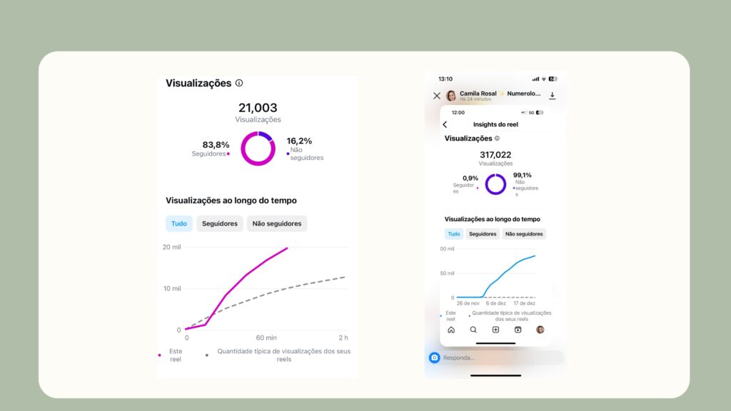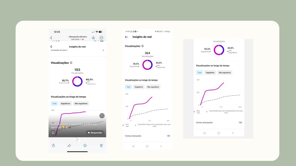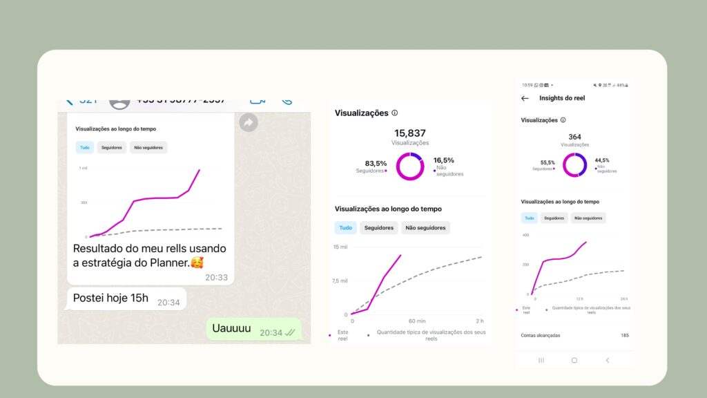 Esses prints são dos insights de várias empreendedoras que já usam o planner viral, a linha pontilhada é a média de alcance dos reels delas e colorida é o desempenho do vídeo que usa o gancho viral.